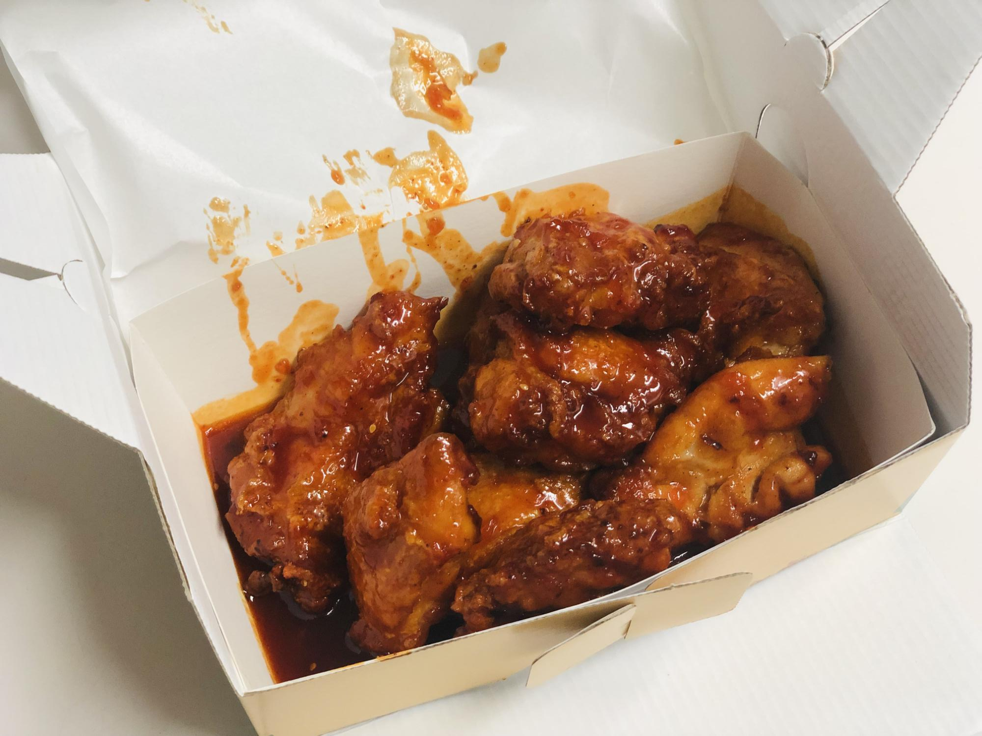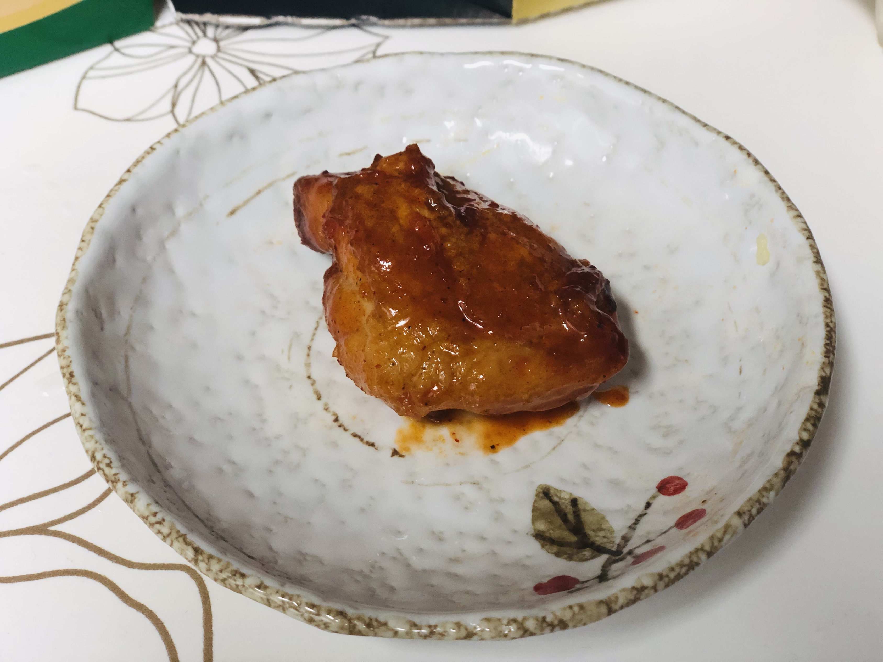 치킨을 열어보니 약간 고추장 맛이 날 것 같은 비주얼입니다.