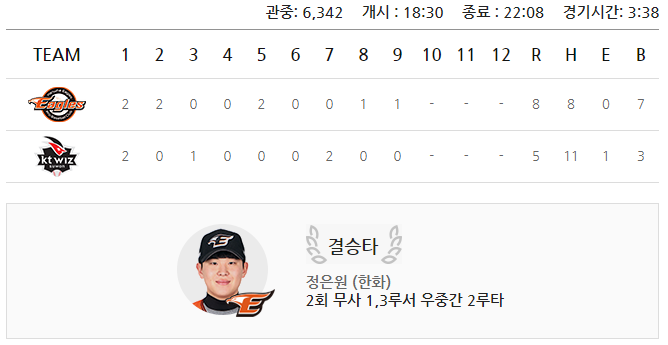(한화이글스 8:5 승)