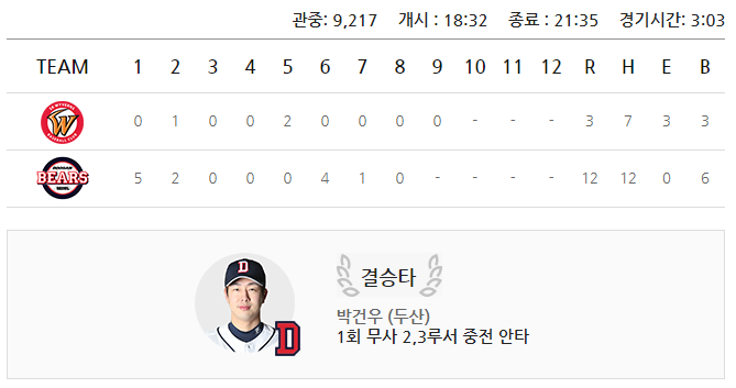 (두산베어스 12:3 승)