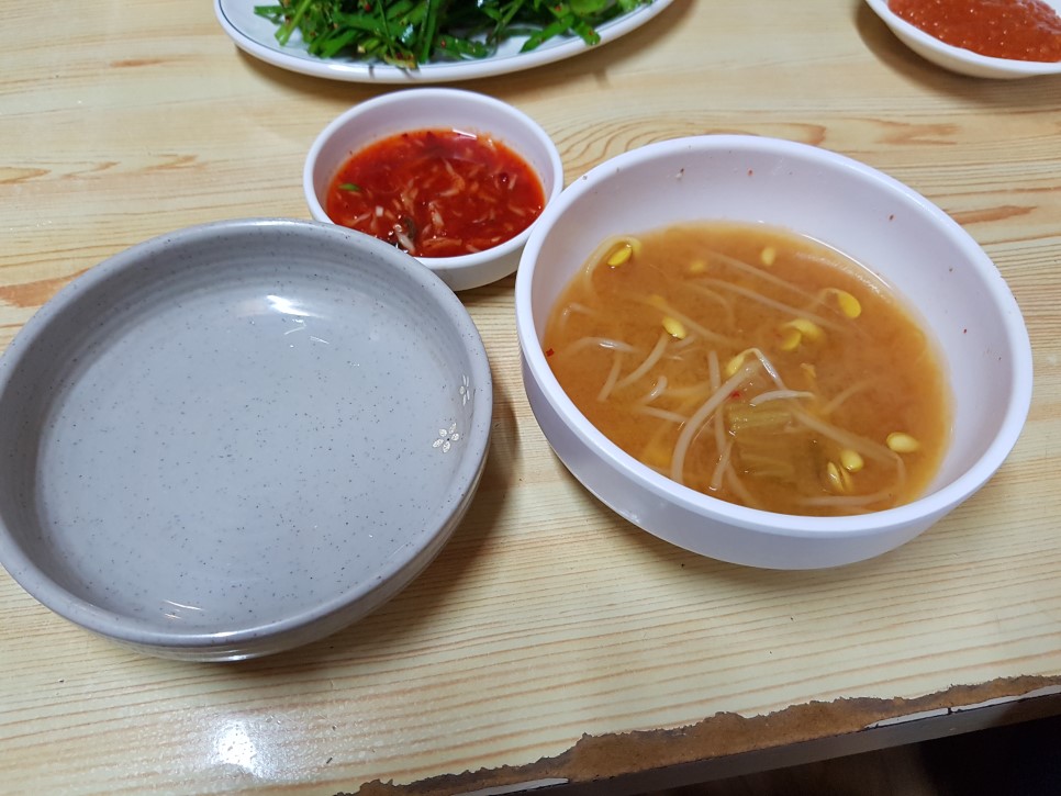 (무채, 콩나물국, 당근, 오이, 부추무침,