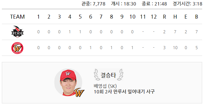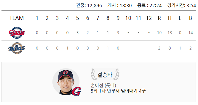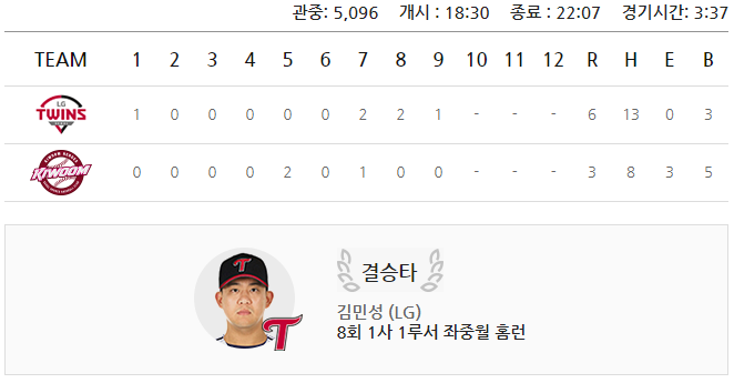 이날 경기는 LG트윈스가 6:3으로 승리했습니다.