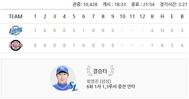 이날 경기는 삼성라이온즈가 승리했습니다.