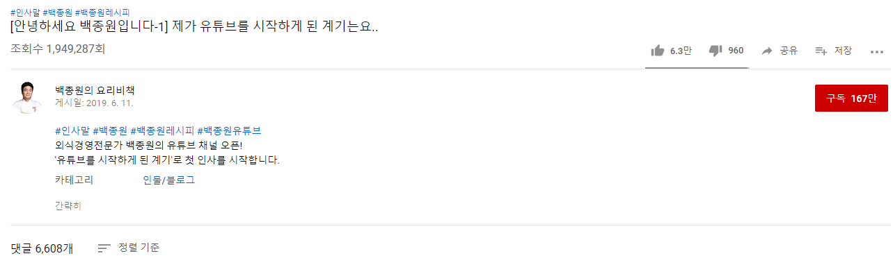 첫번째 영상인 '안녕하십니까 백종원입니다'를