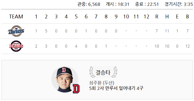 | 오늘의프로야구결과 두산베어스 사상최초 1이닝 8사사구 5득점 등 (0) | 2019.06.17 |