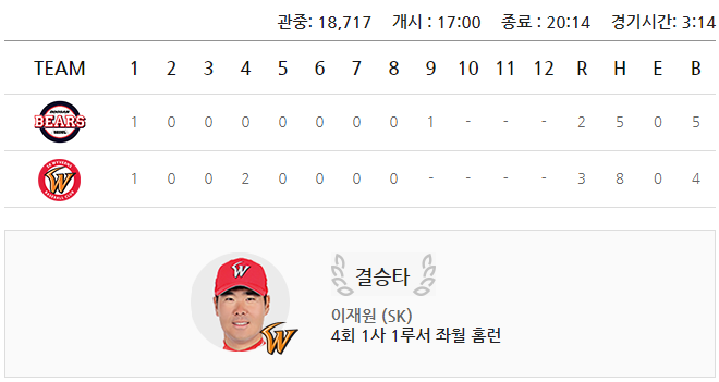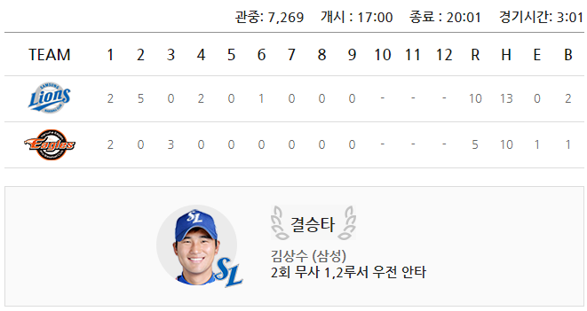 이날 경기는 삼성라이온즈가 10:5로 승리했습니다.