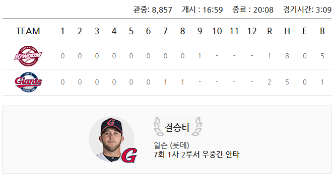 이날 경기는 롯데자이언츠가 2:1로 승리했습니다