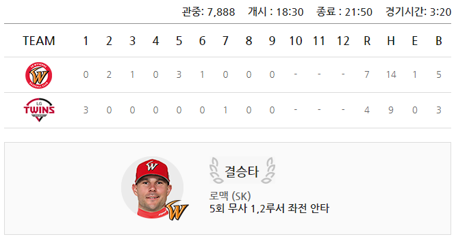 이날 경기는 SK와이번스가 7:4로 승리했습니다.