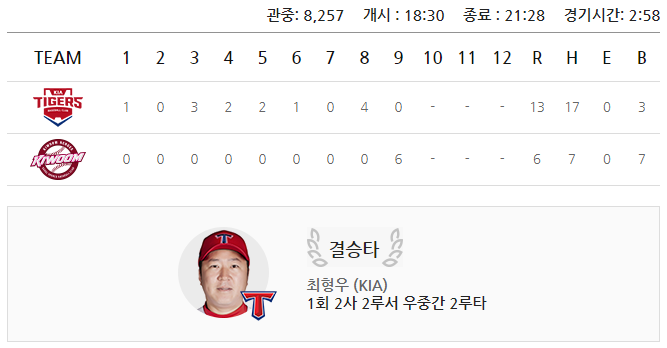 (기아타이거즈 13:6 승)